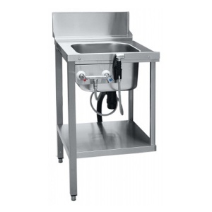 имеет цельнотянутую ванну для предварительного ополаскивания посуды (400х400х250 мм), душирующее устройство для холодной и горячей воды, регулируемые по высоте ножки, нижнюю полку и направляющие для установки трех кассет 500х500 мм. Крепление к посудомоечной машине осуществляется с помощью верхнего зацепа и нижних винтов. Путем несложного монтажа стол можно установить как в левом, так и правом исполнении.
